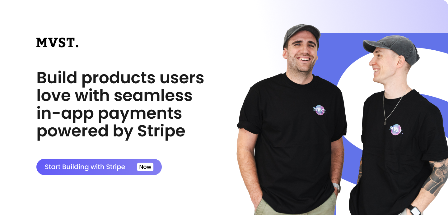 Looking to build a product with in-app payments? At MVST, we deliver secure, scalable, and frictionless payment solutions powered by Stripe. Whether it’s single payments or subscriptions, we’ll help you create a seamless experience your users will love. Let's Chat!