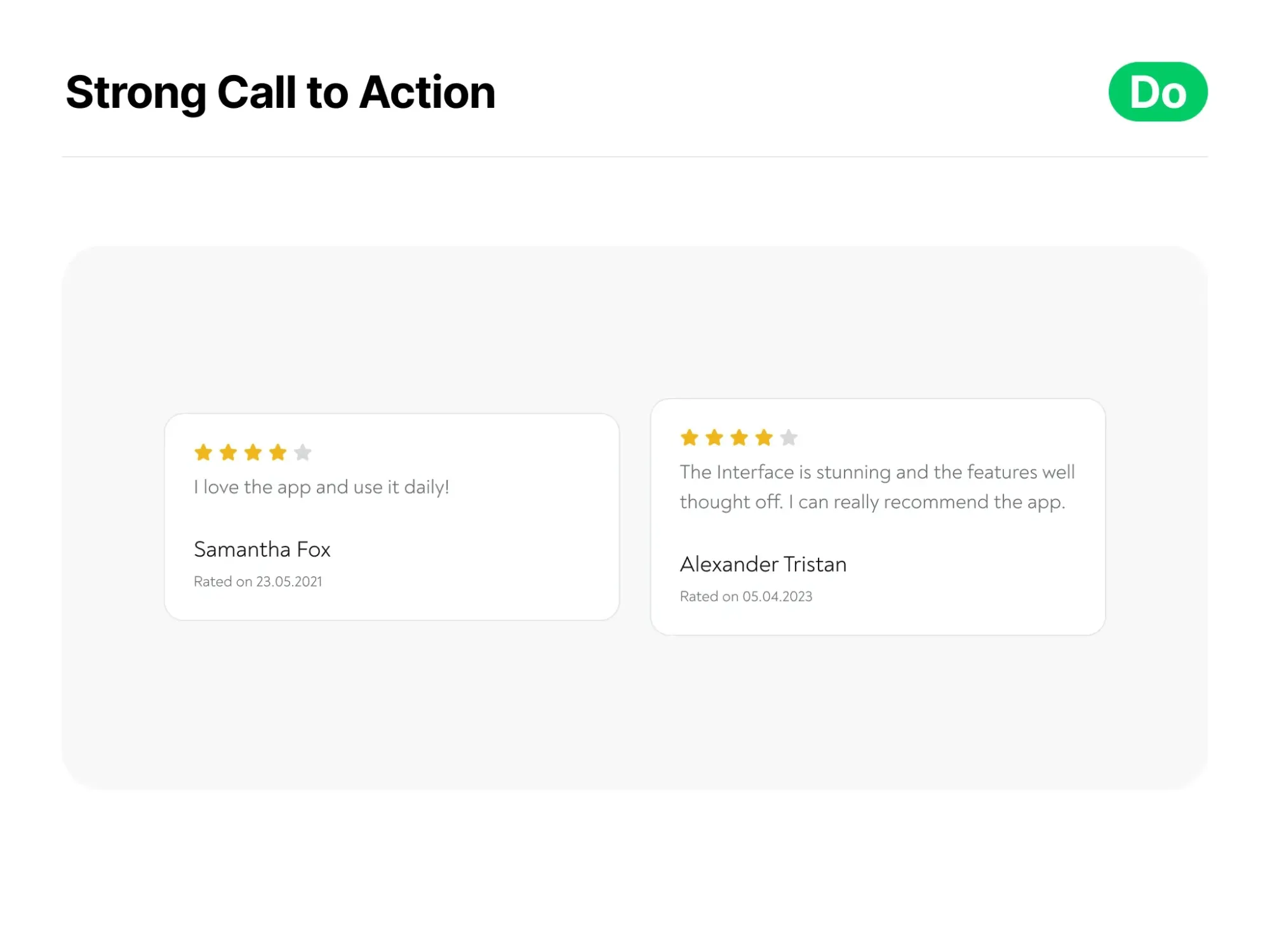 Dein CTA (“call to action”-Button) ist dein virtueller Händedruck, der das Geschäft mit deinen Besuchern besiegelt. Hier lautet das Stichwort Präzision: Verwende eine klare und unmissverständliche Sprache, die keinen Raum für Unklarheiten lässt. Sag den Nutzern genau, was passiert, wenn sie auf den verlockenden Button klicken.