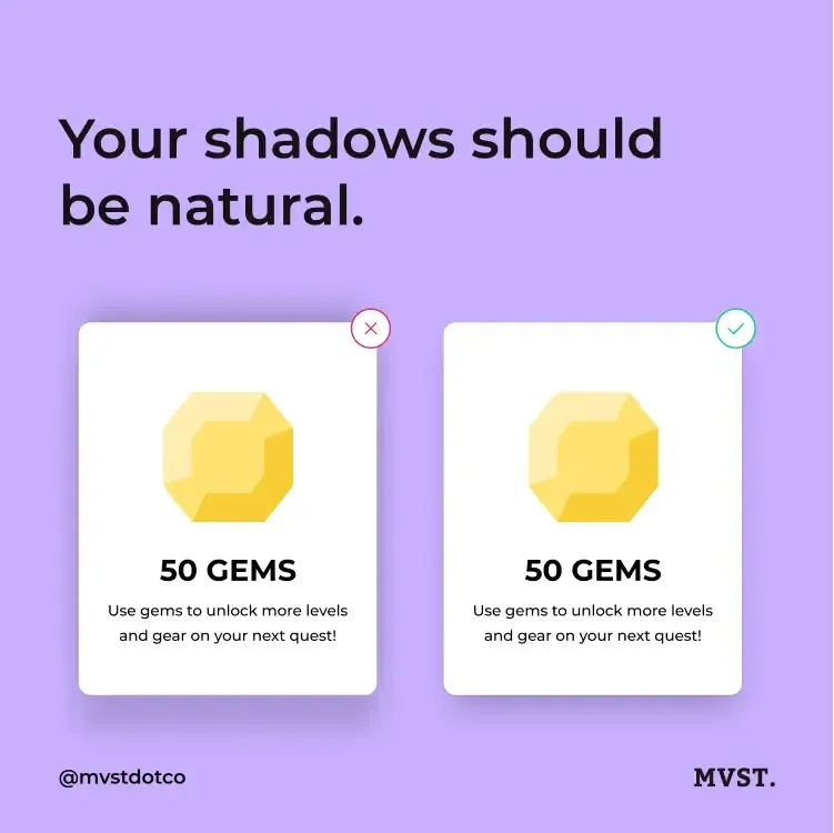 We have already learned that shadows are important to create contrast and plasticity. It is important to note that shadows should always come from one light source to appear natural. So, for example, always from above. Keep that in mind when adding awesome shadows to your elements. To step up your shadow skills, try to add a subtle color (maybe the tone of your natural UI color). This will help you achieve an overall polished look.